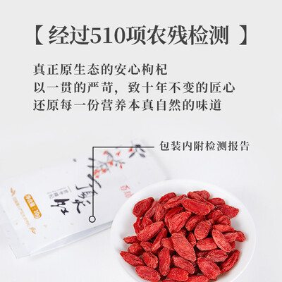 粒粒精选果大饱满、营养成分丰富的枸杞,经过全自动化生产,全程质量监控,产品通过510项严格的农残检测,确保安全健康。