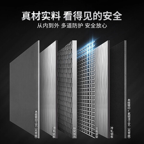 门框采用冷轧钢板制作,搭配蜂窝结构填充,真材实料匠心工艺,超C级锁芯采用8轨道36叶片不规则排序有效防开启。