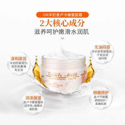 精选山羊奶、麦卢卡蜂蜜、向日葵籽油和天然植物维E,保湿滋润肌肤,令肌肤愈发细腻。富含氨基酸等细小分子,更易被肌肤所吸收。