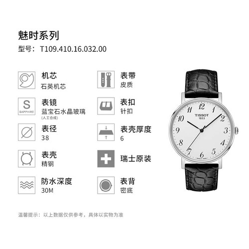 表盘加入了简约的数字刻度,方便读时,清晰明了。柔韧的皮革材质表带,具有细致的纹理,不易开裂变形。