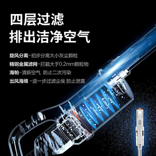 单级旋风式进气结构,能将粉屑迅速卷入,还可避免滤网堵塞,带来持久强劲的吸力。再配合四层过滤可以,有效避免二次污染。