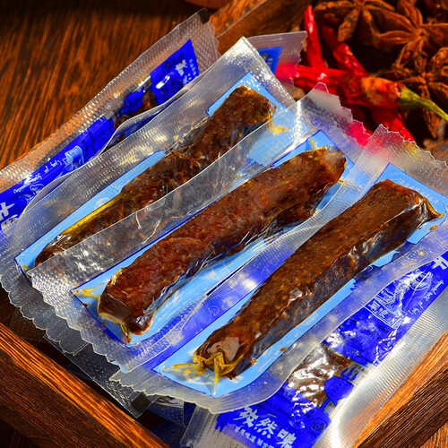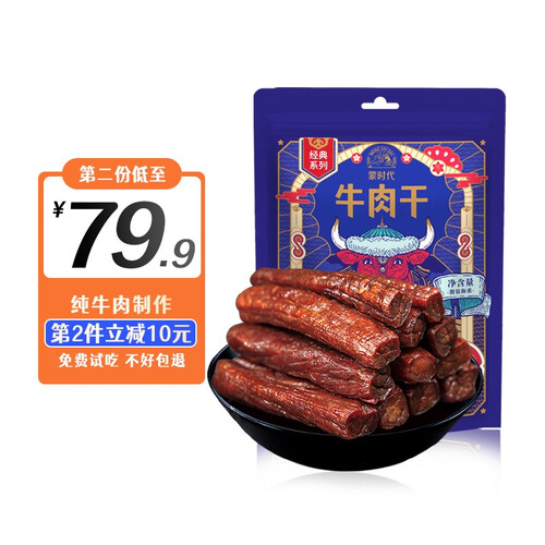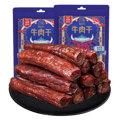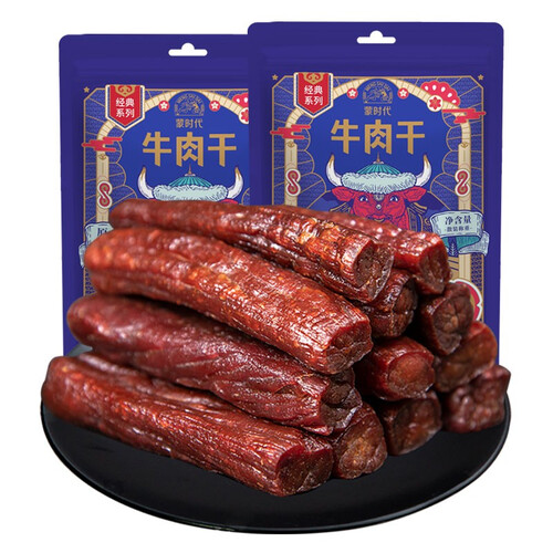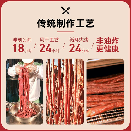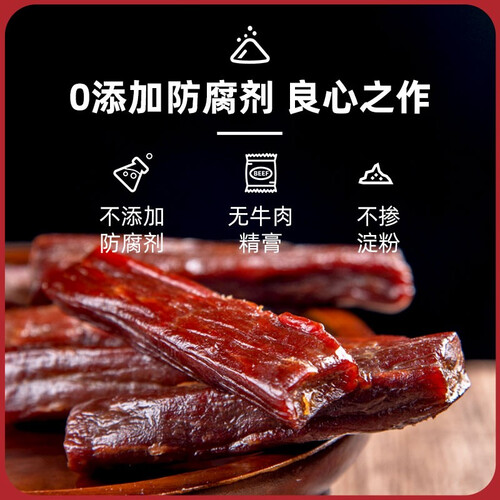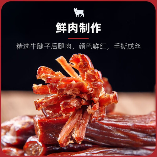 精选科尔沁大草原黄牛鲜肉,通过18小时人工腌制,36小时自然风干和24分钟循环烘烤,肉丝如发,纹理清新,口感舒爽。