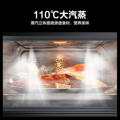 蒸汽立体直喷,高温蒸汽迅速渗透食物内部,受热均匀,大容量的内腔,可烹饪大件食物,美观易清洁。