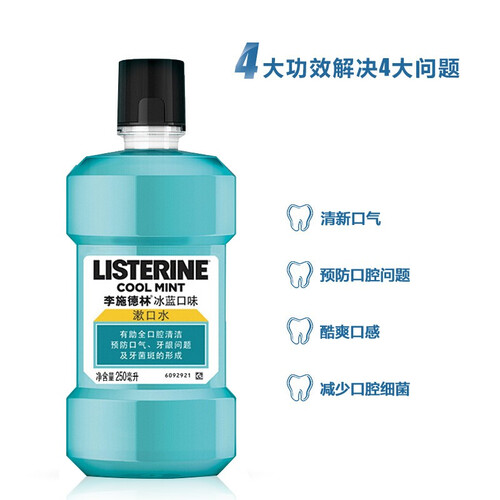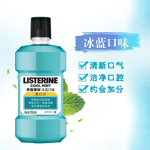 蕴含少量酒精成分,具有出色的抑菌效果,助力口腔健康卫生,冰爽的口感清爽舒适,可让口腔能持久清新,去除口臭。