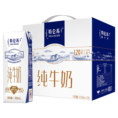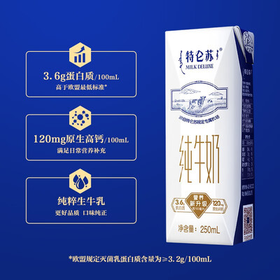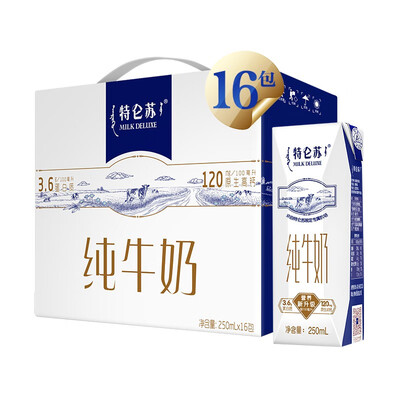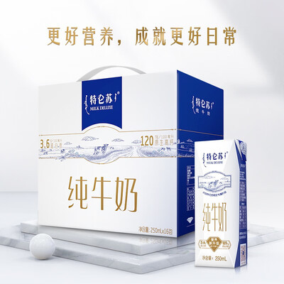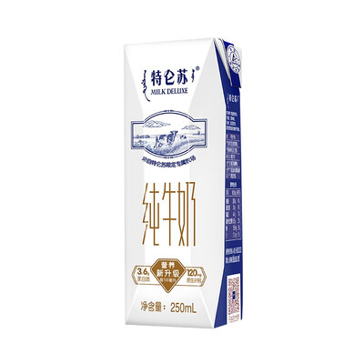 蒙牛特仑苏纯牛奶,来自黄金奶源带,特仑苏限定专属牧场。每100ml牛奶含优质乳蛋白3.6g,原生高钙120mg。