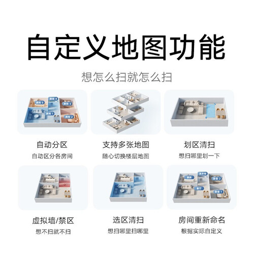 APP远处控制。内置大口径悬浮吸口。全屋清洁路线规划,不重复不漏扫。内置运动传感器,复杂家居环境轻松适应。