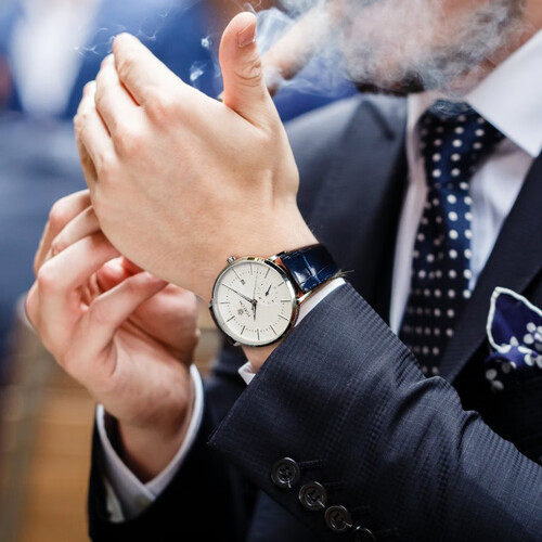 休闲风的圆盘钢表淡雅的白色系基底,使其看着更多了几分儒雅大气。罗马时标与针形时标融合,简约耐看,凸显简约时尚气息。