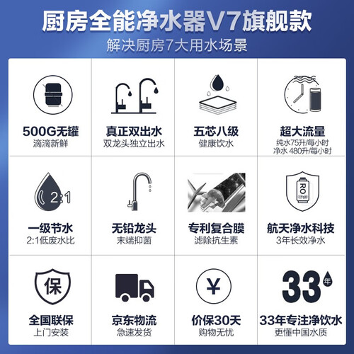 配备无铅水龙头,材质安全健康,出水卫生,使用更放心。这款净水器采用双出水设计,生活用水、直饮水可自由切换。