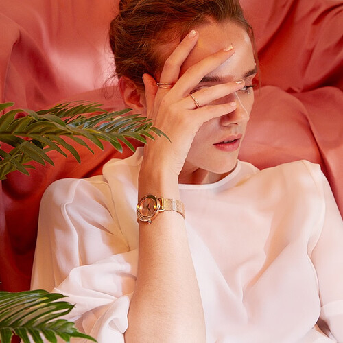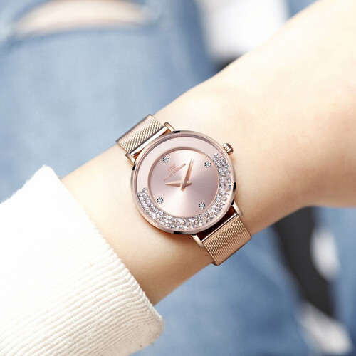 双同心圆表盘,增添灵动水晶于弧形镜面上回旋、转动,肆意起舞浮沉,一举凸显活泼俏皮女性范,且皇冠表冠,方便自由省心调时。
