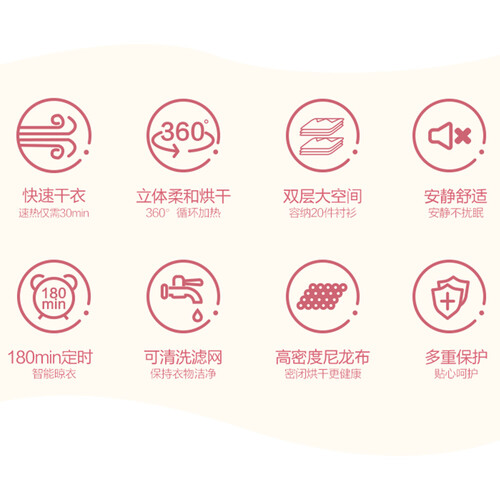 拥有300L大容量,一次性可满足全家衣物烘干需求,不再为阴雨天气衣物无法晾晒而烦恼。70°高温烘衣功能,快速除菌螨。