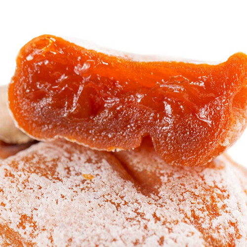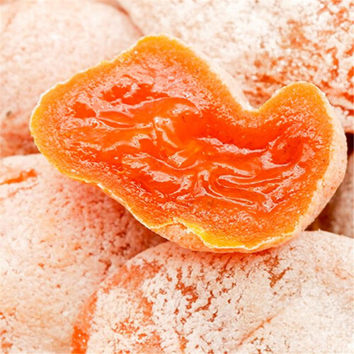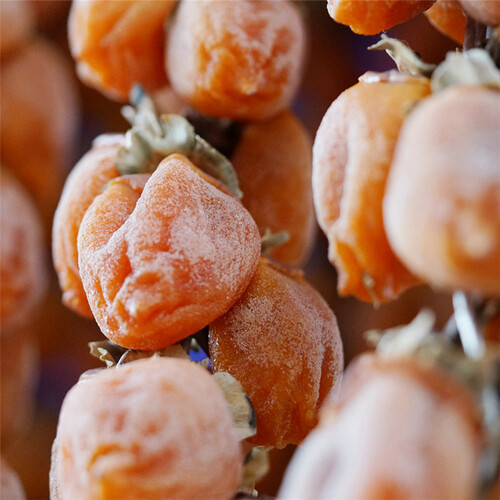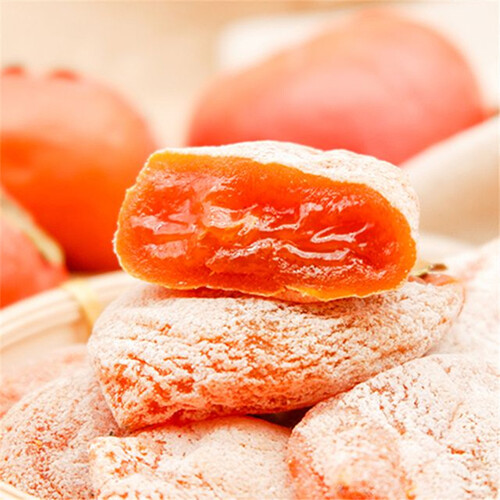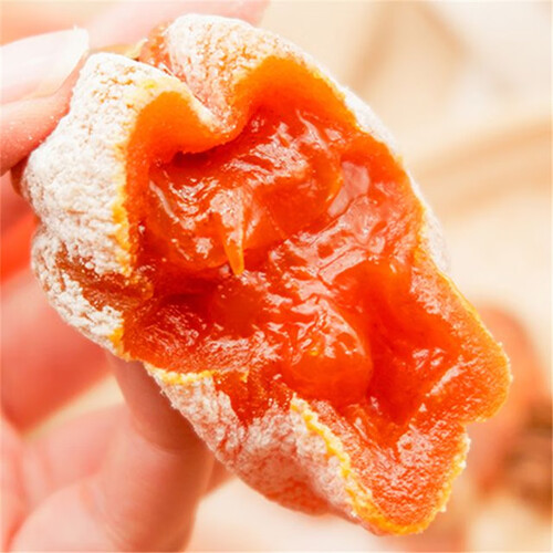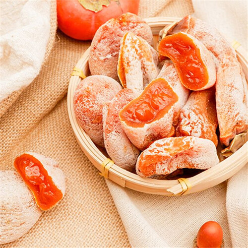 富平柿饼采用富平独有的升底大尖柿削皮之后上架吊晒40多天自然霜降而成,形状呈长锥形,口感软糯香甜。