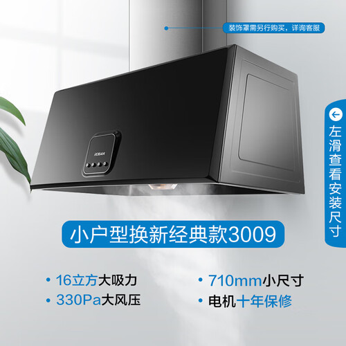 小尺寸设计,适应多种安装场景,小户型也能轻松使用。采用一体成型集烟腔,不易藏污纳垢,清理方便少残留。