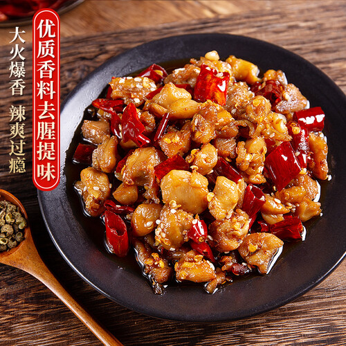 采用地道川味炒制技艺,由自贡当地老师傅手工炒制,火候掌控恰到好处,辣子鸡质地酥软、麻辣鲜香,是解馋零食或下酒菜的优选。