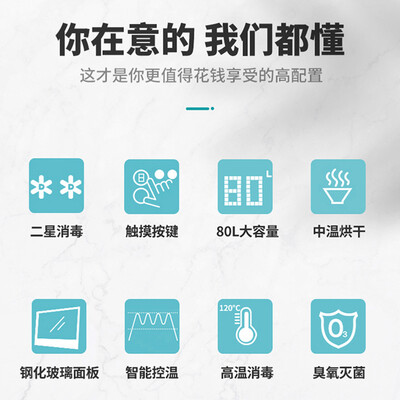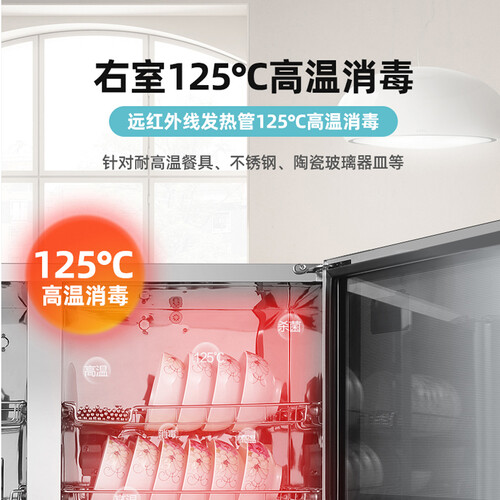采用了嵌入式的设计,可以挂在厨房,小户型也可以使用。左右独立的控制,餐具消毒清晰可见,环保又健康。