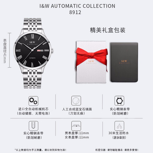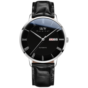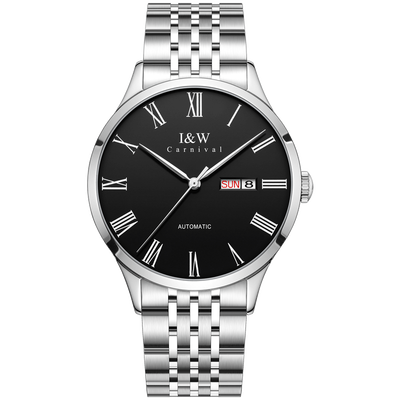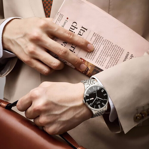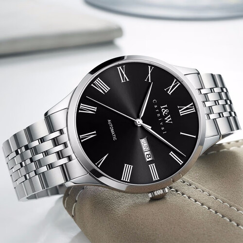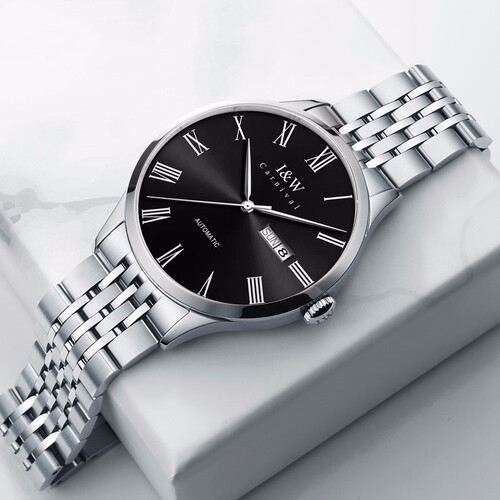 本色黑面,银色精钢带,进口超薄机芯,全自动储能,无需电池,走时精准,是一款气质冷冽的男士腕表,展现阳刚型格。