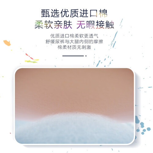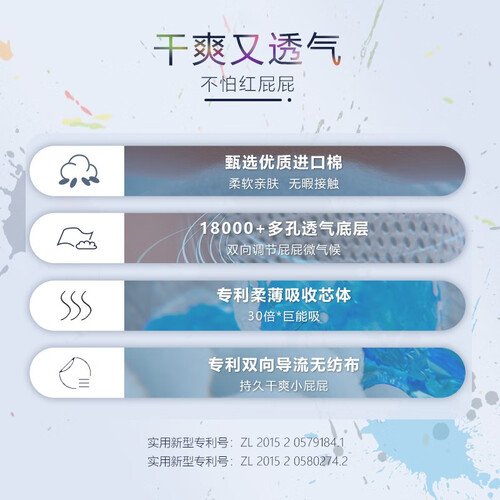 柔薄专利吸液芯体,材质薄不起坨,强效锁水不易漏。专利双向导流面料,一有尿液瞬时吸收,快速分层导流,持久干爽一整天。