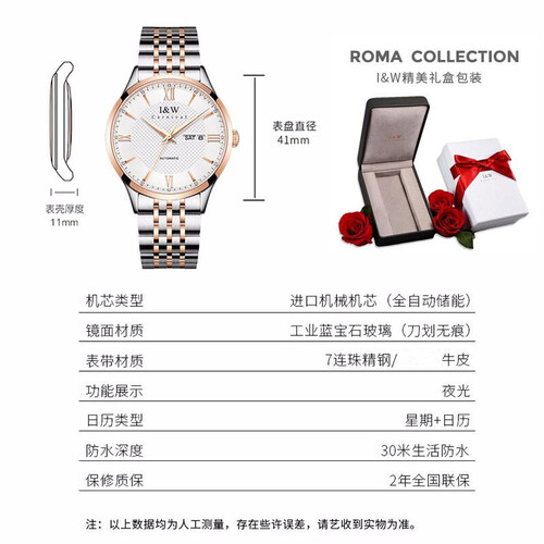 I&W的这款瑞表,使用了工业蓝宝石玻璃镜面,不仅防划耐磨,刀刮无痕,而且滴水成珠,防水性较好,让您日常佩戴更放心。