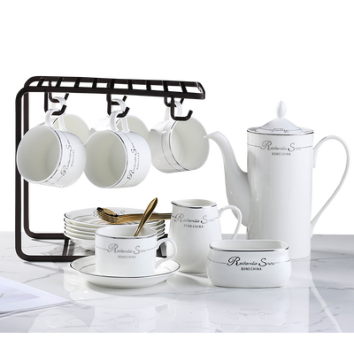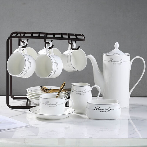 欧式风格银边咖啡杯套装,拥有咖啡壶、奶缸、咖啡杯等配套齐全,洁白釉面亮丽如新且易于清洗,搭配杯架易于收纳。