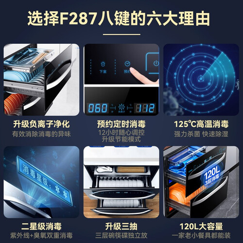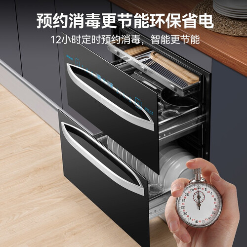 负离子净化功能,一键开启后可自动消除消毒产生的异味,让餐具保持洁净,结合12小时预约消毒,随时调控更方便。