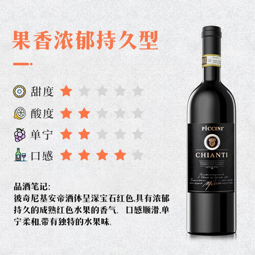 意大利名庄出品,DOCG品质,优选桑娇维塞等三种葡萄混合酿制,酒体呈红宝石颜色,入口饱满柔顺,果香回味。