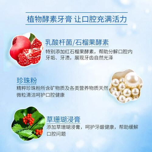 添加红石榴果植物酵素成分,帮助分解口腔内的牙垢和牙渍,还原牙齿的自然光泽。内含高浓度草珊瑚浸膏,给口腔清洗舒适体验。