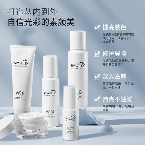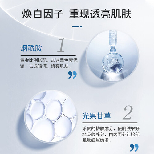 融入白茶茶叶精粹成分,在提亮肤色的同时兼顾营养补充。配合烟酰胺成分,加乘亮肤效果,由内而外绽放亮透肌肤。