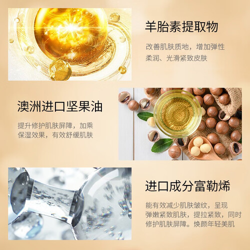富含澳洲进口坚果油、富勒烯、水解胎盘素等多种成分,能够帮助改善肌肤细纹,使肌肤变的紧实光滑,长效锁水保湿,更有光泽度。
