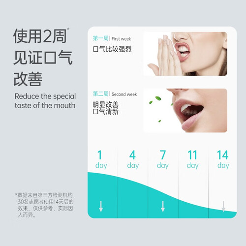含有水合硅石、植酸钠等成分,清洁顽固优质,减少牙菌,改善牙黄。搭配益生菌配方,维持菌群平衡,持久清新口气。