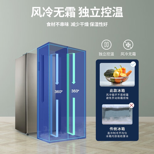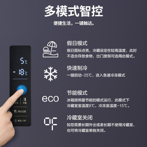 采用环绕送风模式,使风力均匀,减少结霜现象,无需费力清洗。冷藏室配置单独开关,无需时可关闭,成功节省电量。