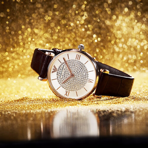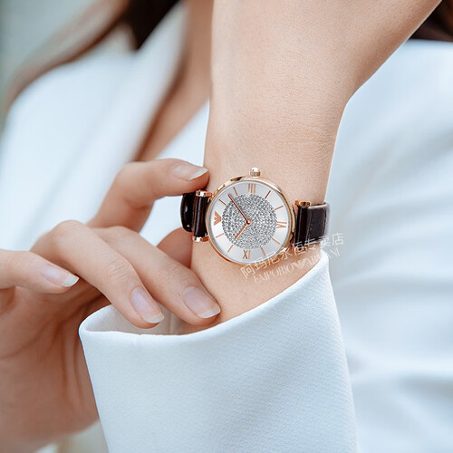 满天星表盘设计,自带闪耀光泽,结合玫瑰金表圈,尽显时尚大气之范,且人工矿物强化玻璃镜面,防刮耐磨,历久弥新。