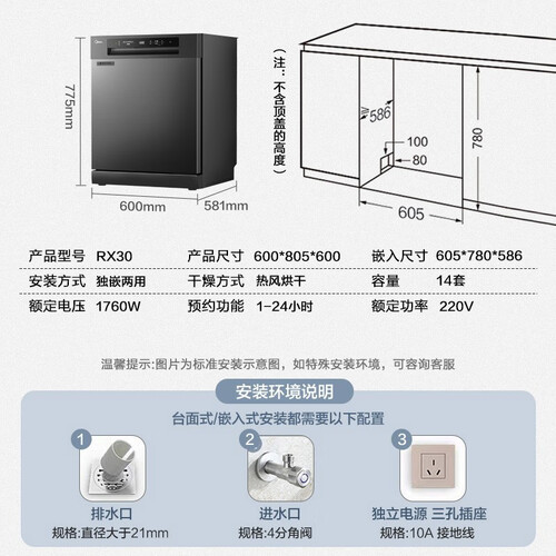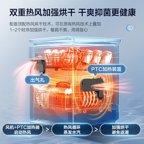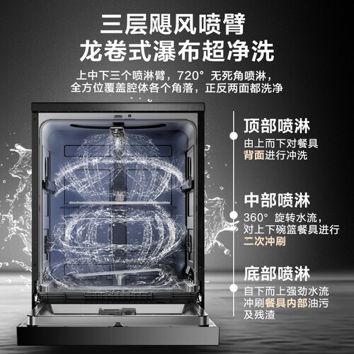 双重热风烘干技术,餐具整洁不返潮。三层立体喷淋系统,提供强劲水流冲刷,提高清洁效率。支撑脚可调节,独嵌两用适合各种户型。