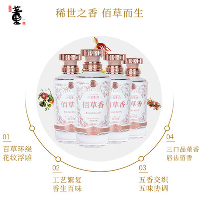遵循百年古方,入130余味本草制曲,双曲双窖发酵,酒体味道协调。经典瓶身和细致打磨的瓶口,带有百草图萦绕,独具韵味。