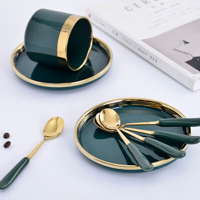 北欧风格咖啡杯碟,真空镀金墨绿色釉,搭配杯架收纳美观又时尚,收纳架采用烤漆工艺制作,漆面不易脱落更加耐用。