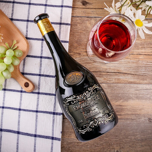 瓶身采用金属立体浮雕设计,彰显奢华与高贵的气息。精选原料,所酿之酒入口柔和、不酸不涩、果香浓郁。