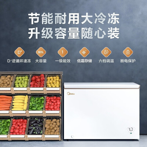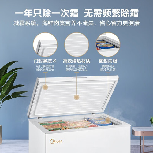 机身采用整体拼接白色内胆,表面光滑不藏污垢,有效延长冰柜有效寿命。D+速冻系统,加速度制冷,冻力全开。