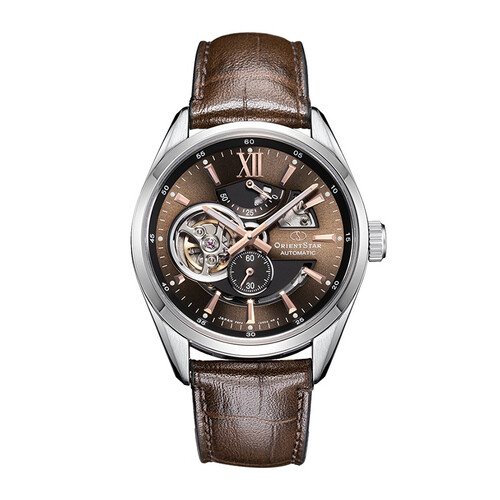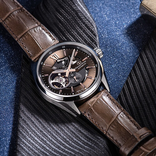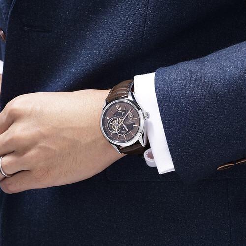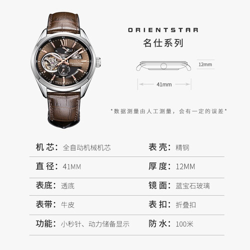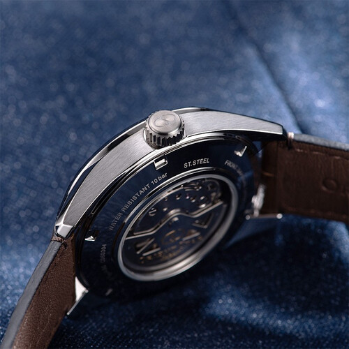 开窗透芯的表冠设计,充满个性时尚。复古简约的外观,也能很好的融入各种穿搭之中。背透的表底,尽显机械运作美感。