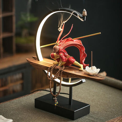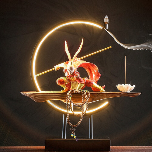 齐天大圣摆件,烟雾缭绕,禅意浓厚,摆放茶桌上,更增添品茶趣味性。LED半圈暖灯,温馨舒适,带来不一样的生活形式感。