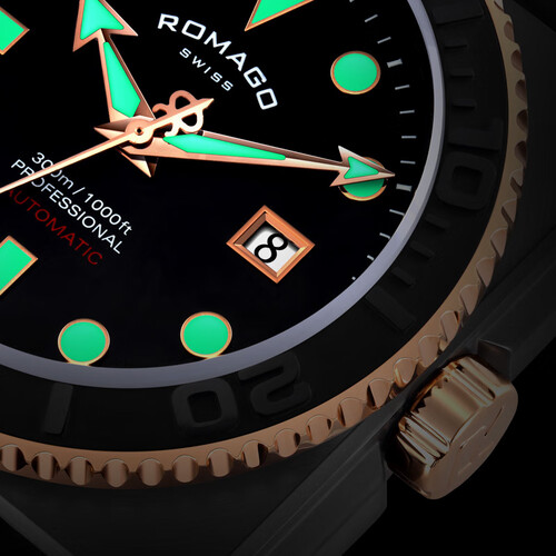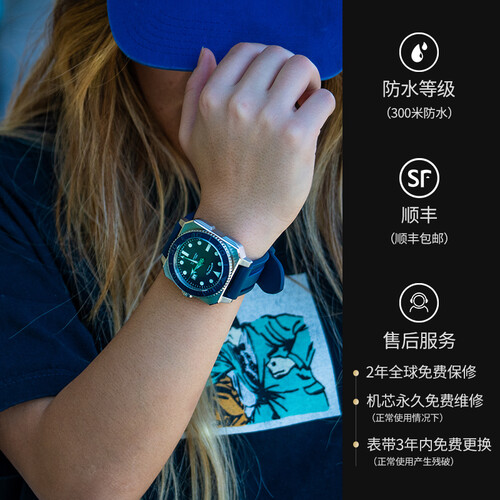 安全式旋入式表冠,避免水分子渗入,加强防水性能,防水深度达300米,可应对多项水上活动。全自动瑞士机芯,走时准不误事。