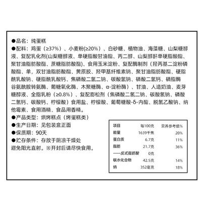 选用优质鸡蛋,小麦粉,奶粉,按比例添加,真材实料,不加一滴水,也没有多余的奶油夹心,蛋香味纯正浓郁,口感蓬松绵软。