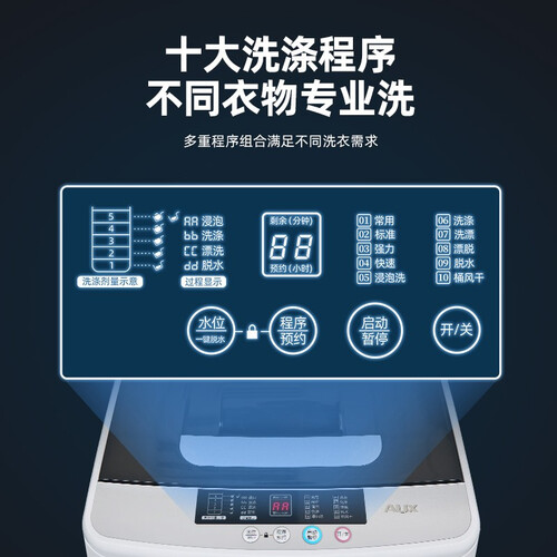 这款波轮洗衣机特设快洗程序,能有效节约时间,不耽误出行。24小时自由预约洗涤,提前放入,到点自动清洗,更具人性化。