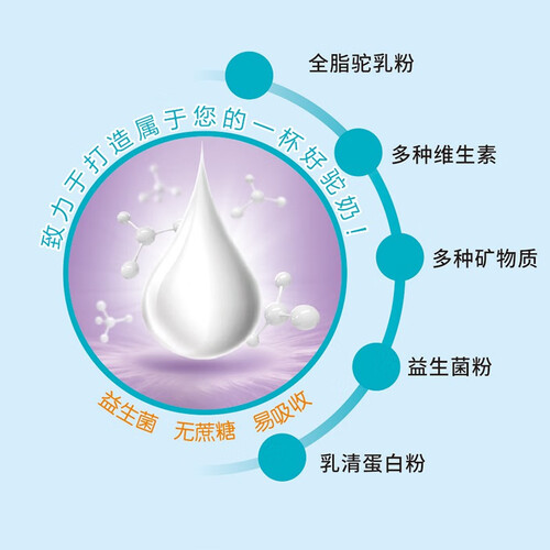 纯驼乳含量高达75%,提供优质的乳蛋白,营养丰富好吸收。源自内蒙古牧场直达,奶源纯正鲜活,制作出来的奶粉品质俱佳。