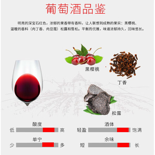 选用多品种的葡萄,采用传统方法,橡木桶酿造,带有丰富的辛香料香味。宝红石色的酒体,平衡而优雅,味道浓郁持久。