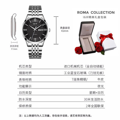 精钢表壳,散发出高贵的气质,大气优雅。机械机芯,走时精准,不需频繁调试。