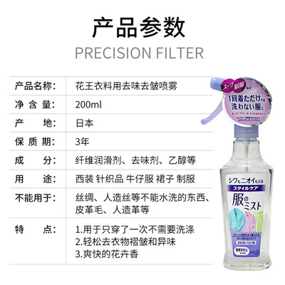 采用喷雾式装瓶,轻松一喷就可去除皱褶,使衣物恢复平整,柔顺如新。去异味效果好,减少衣服清洗频率,延长衣服穿着寿命。