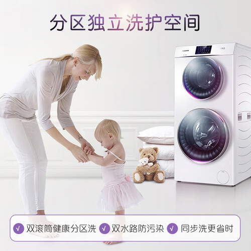 搭载了变频电机,低噪运行不扰人,上下双筒设计,增大容量不占空间,更能分区洗衣,让宝宝穿上洁净好衣。