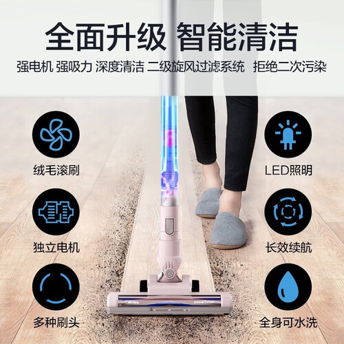 吸尘器内置双电机,提供十足的动力,吸尘顺畅无阻。具有前置探照灯,适合打扫角落,让灰尘无处可躲。