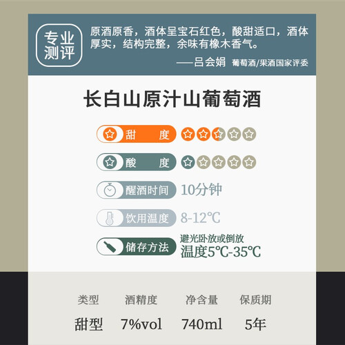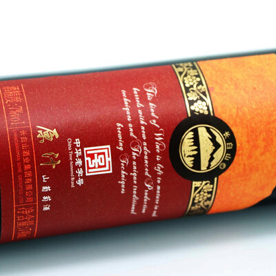选自野生山葡萄种植基地,环境适宜生产高品质的原料。酒体呈宝石红色且厚实,结构完整余味有橡木的香气。