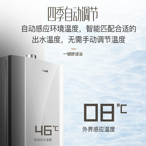 智能恒温系统,有三大传感器能检测到外界温度变化并及时调整出水温度,确保水温恒定。大水量,能满足多卫家庭同时用水的需求。