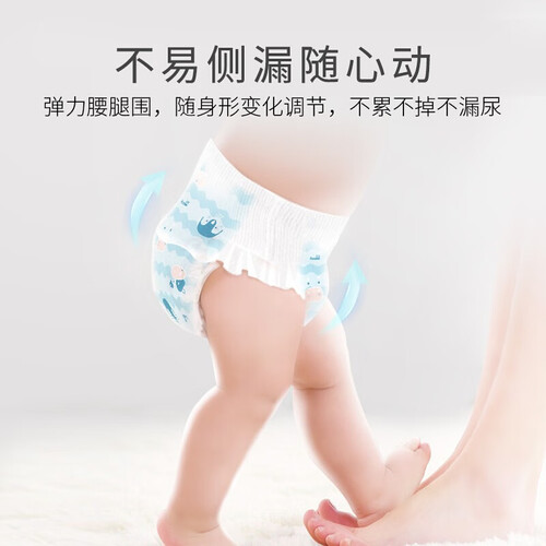 亲肤的云柔面层,好像云朵一般环绕宝宝的肌肤。腰腿围弹力十足,可以根据身形来自动变化调节,不会产生勒痕。