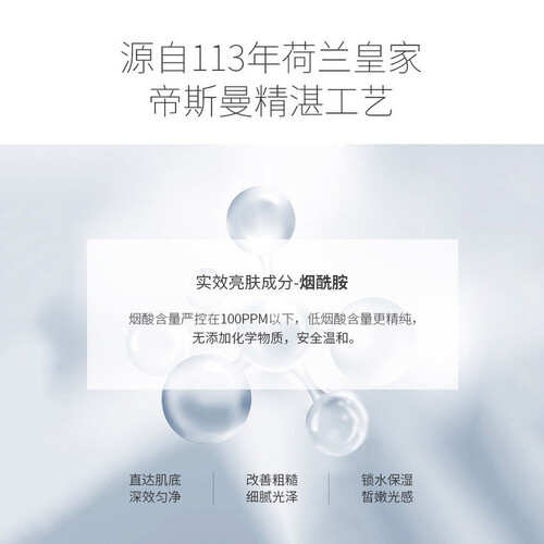 内含烟酰胺成分,可以均匀焕亮肌肤,由内而外的焕发亮白光采。无化学物质添加,温和无刺激,可以放心使用。